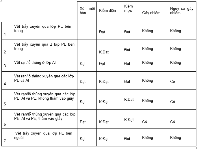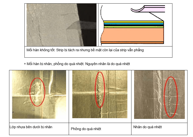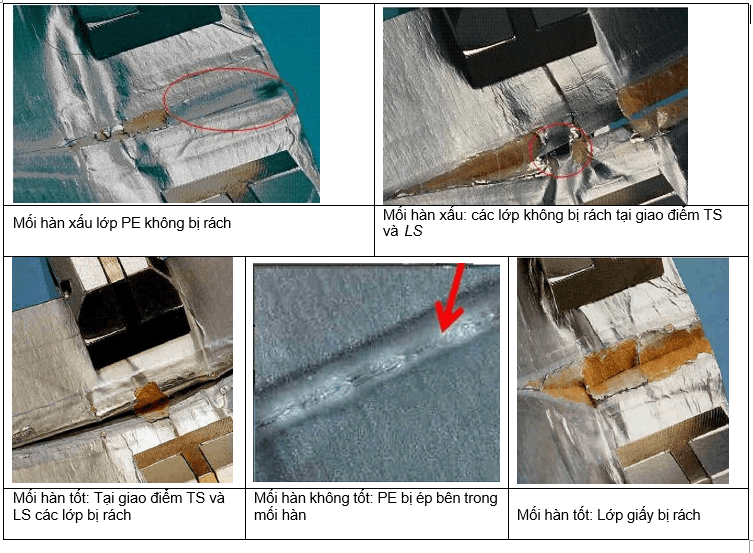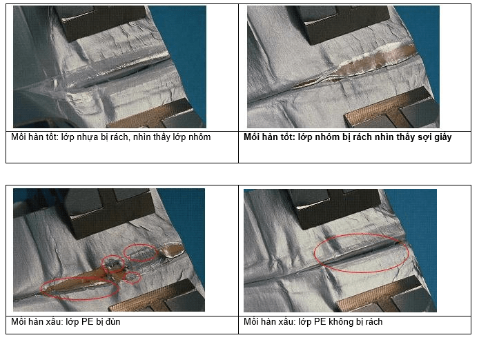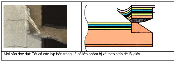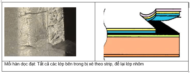 Mối hàn là đạt nếu cả hai lớp PE bên trong bị tách theo khi xé strip để lại lớp nhôm và bề mặt của lớp nhôm bị phồng lên.