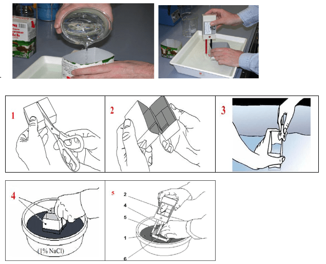 Dùng điện kế đo độ dẫn, một điện cực đặt trong hộp, điện cực kia đặt bên ngoài hộp, trong dung dịch 1% NaCl. Nếu kim điện kế vẫn chỉ về 0: bao bì đạt, nếu kim điện kế lệch khỏi vị trí 0: không đạt