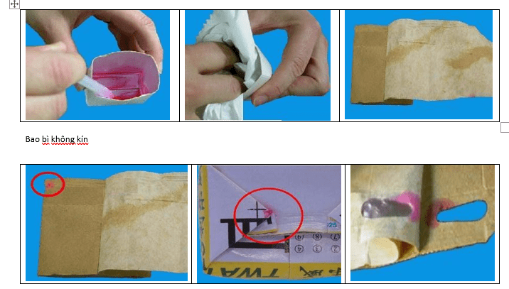 - Quan sát bên ngoài hộp xem có vết mực thấm ra hay không. Sau đó lột từng lớp của bao bì. Quan sát vết mực và đánh giá theo bảng tương quan sau.
