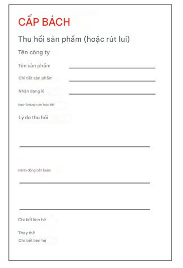 Thông báo thương mại phải được ghi rõ ràng tiêu đề “KHẨN CẤP: THU HỒI SẢN PHẨM” hoặc “KHẨN CẤP: RÚT SẢN PHẨM” (tùy trường hợp), bằng chữ in đậm, kích thước lớn để đảm bảo thông báo được xử lý nhanh chóng. Tránh trình bày thông báo giống như một bức thư thương mại vì có thể không được xử lý khẩn cấp. Các chi tiết trong thông báo cần tạo điều kiện để xác định ngay lập tức và rõ ràng sản phẩm không an toàn được đề cập.