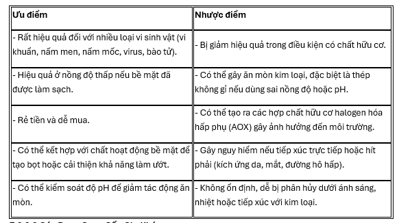Bảng 7 – Ưu điểm và Nhược điểm của NaOCl