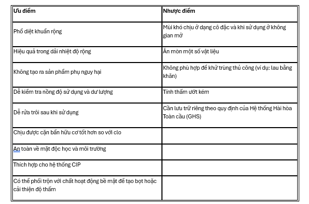Thế hệ axit peracetic mới có bổ sung peroctanoic acid, nhờ đặc tính ưa lipid, cho phép thâm nhập màng phospholipid của vi sinh vật nhanh hơn, từ đó tăng đáng kể hiệu quả diệt khuẩn. Điều này giúp giảm nồng độ sử dụng, rút ngắn thời gian tiếp xúc, đồng thời bảo vệ hệ thống sản xuất, làm cho quá trình khử trùng an toàn và tiết kiệm hơn. Ưu điểm và nhược điểm của PAA được trình bày trong bảng 8